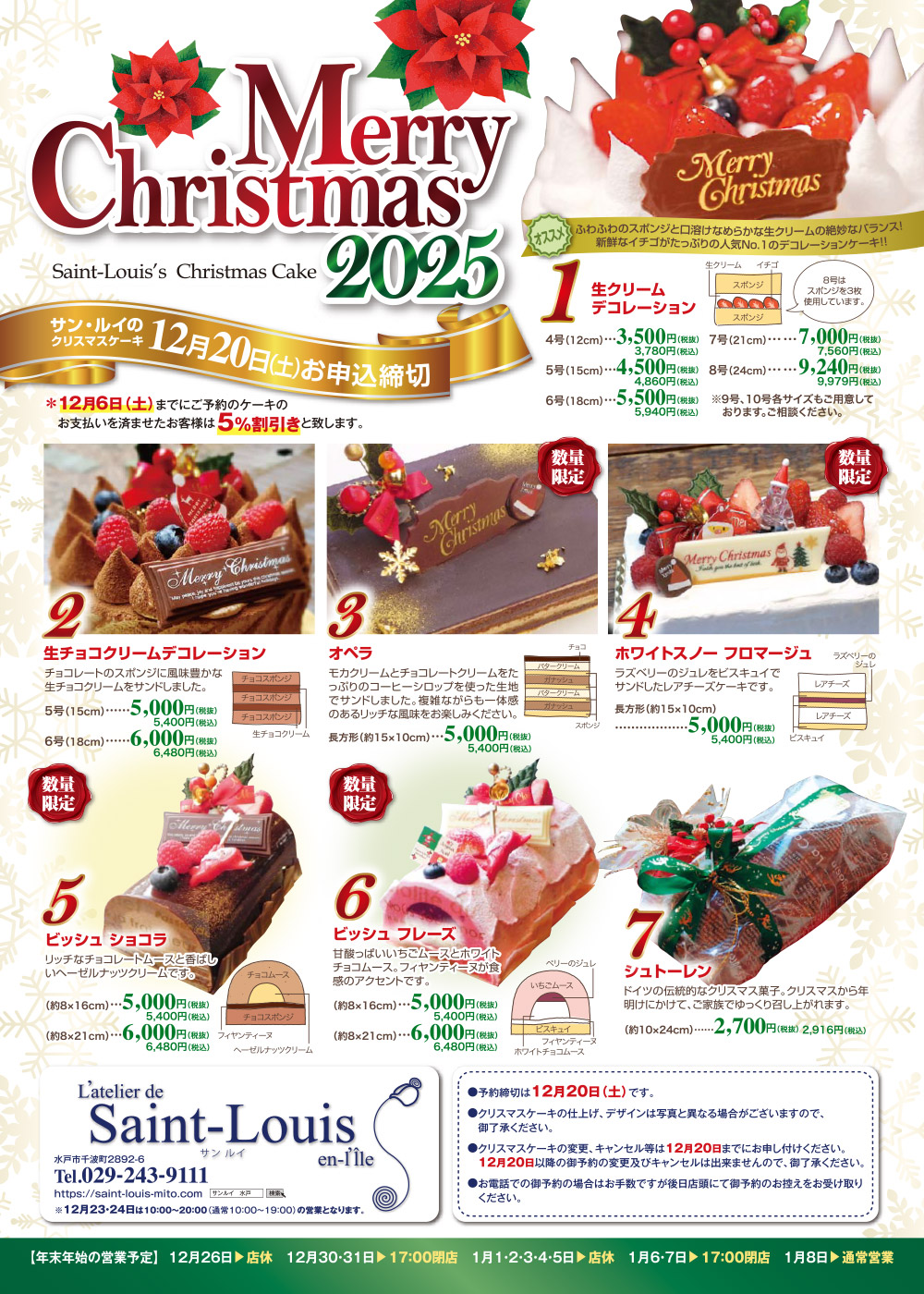 予約締切は12月20日(土)です。 クリスマスケーキの仕上げ、デザインは写真と異なる場合がございますので、御了承ください。 クリスマスケーキの変更、キャンセル等は12月20日までにお申し付けください。12月20日以降の御予約の変更及びキャンセルは出来ませんので、御了承ください。 お電話での御予約の場合はお手数ですが後日店頭にて御予約のお控えをお受け取りください。 12月6日(土)までにご予約のケーキのお支払いを済ませたお客様は5%割引きと致します。