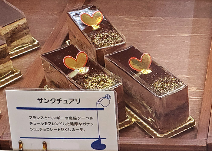 季節や食材状況等によって店頭商品は入れ替わります。季節のフルーツをふんだんに使ったプチガトー。ふわふわのスポンジと甘すぎないかるーいクリームがお口の中に広がります。フランスとベルギーのクーベルチュールをブレンドした濃厚なガナッシュ、サンクチュアリはおすすめです。